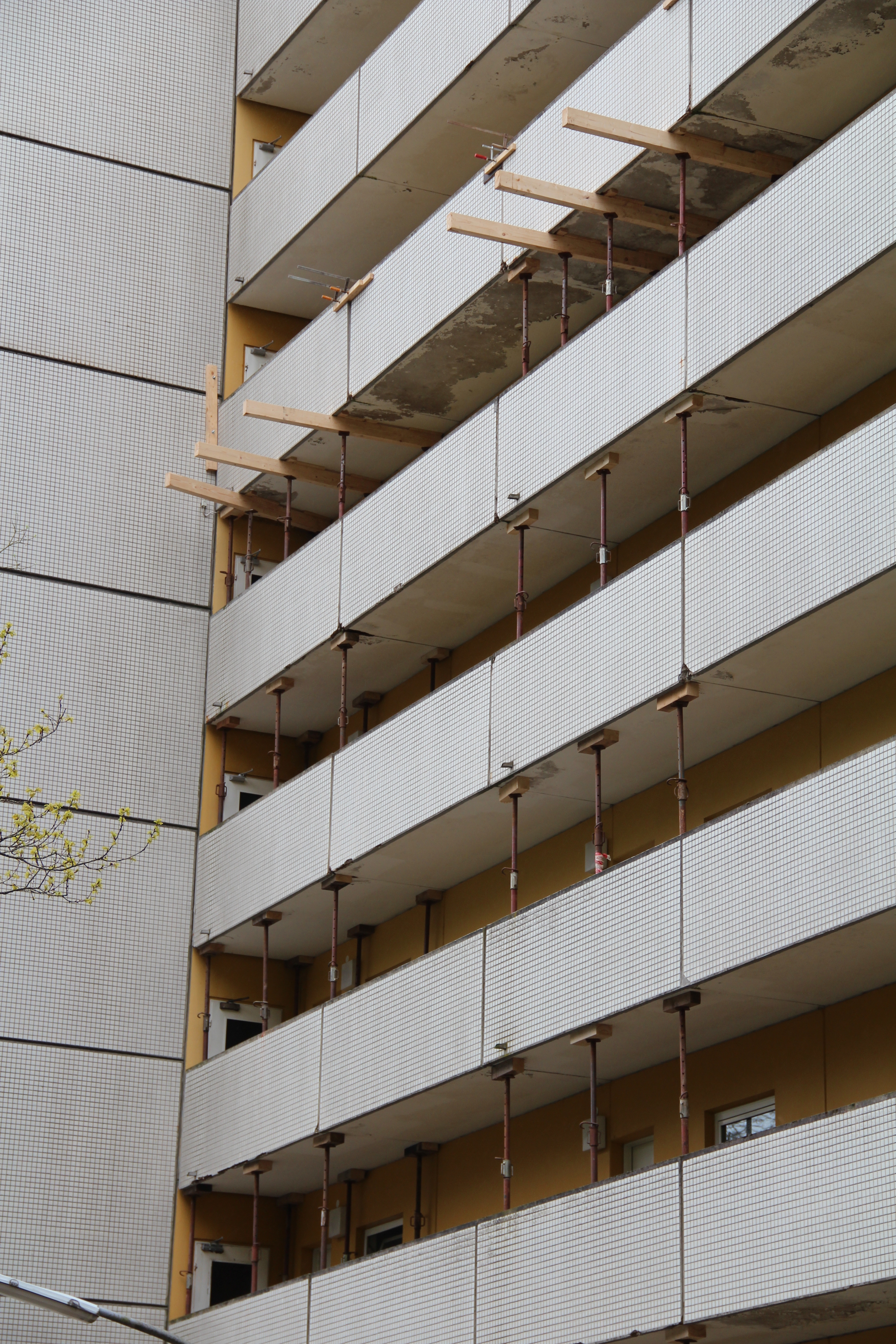 Die Siedlungsgesellschaft hat umgehend reagiert und Sicherungsmaßnahmen durchgeführt. Betroffene Brüstungsplatten werden ab dem Erdreich über das Erdgeschoss bis zur betroffenen Wohnetage abgestützt.