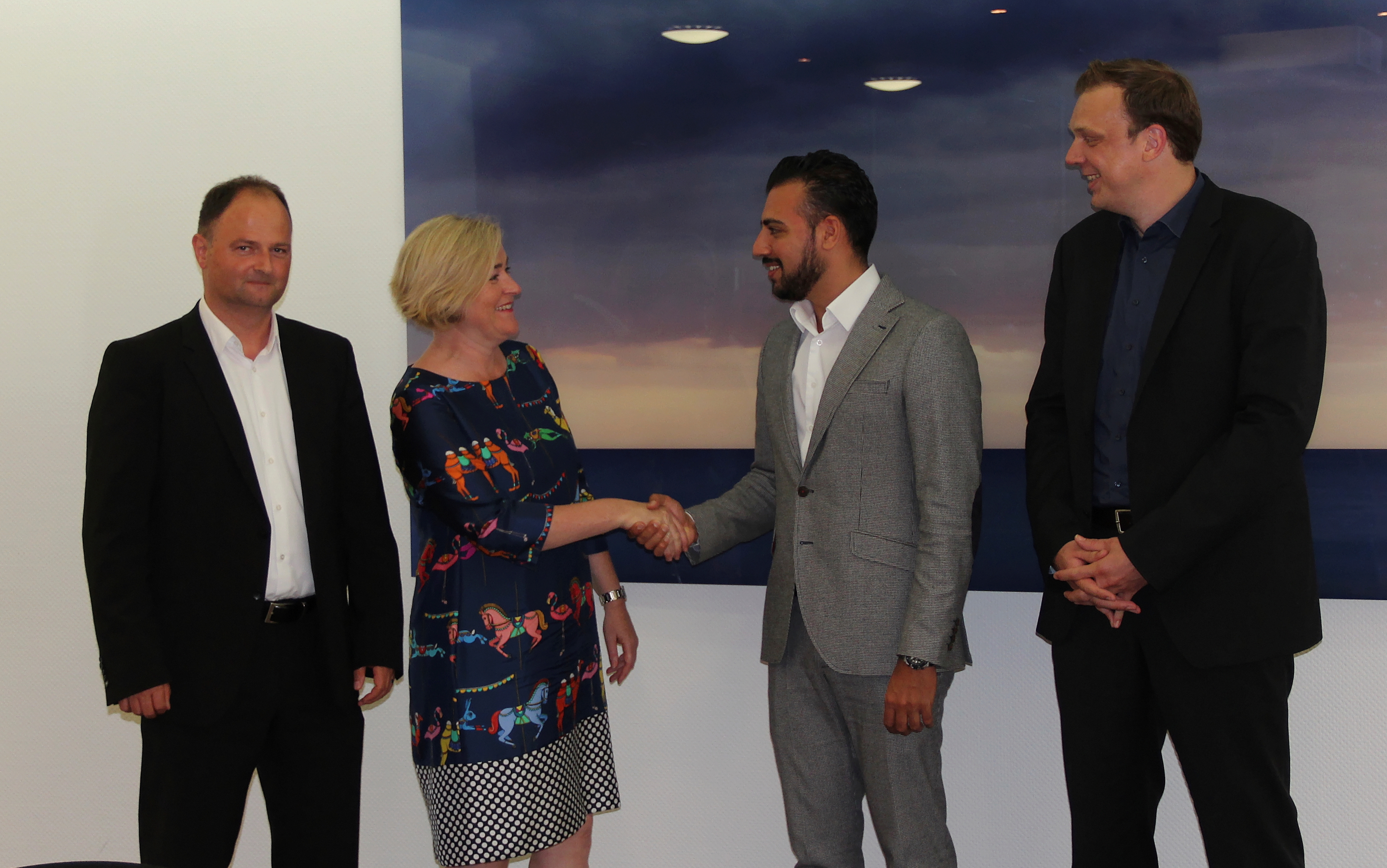 Ein freundschaftlicher und herzlicher Händedruck besiegelt die zukünftige Zusammenarbeit: Stefan Eichhorn, Hildegard Wald (SIB), Rahman Neiro und Marcus Wersuhn (CENTRO Hotel Group). - Foto: SIB