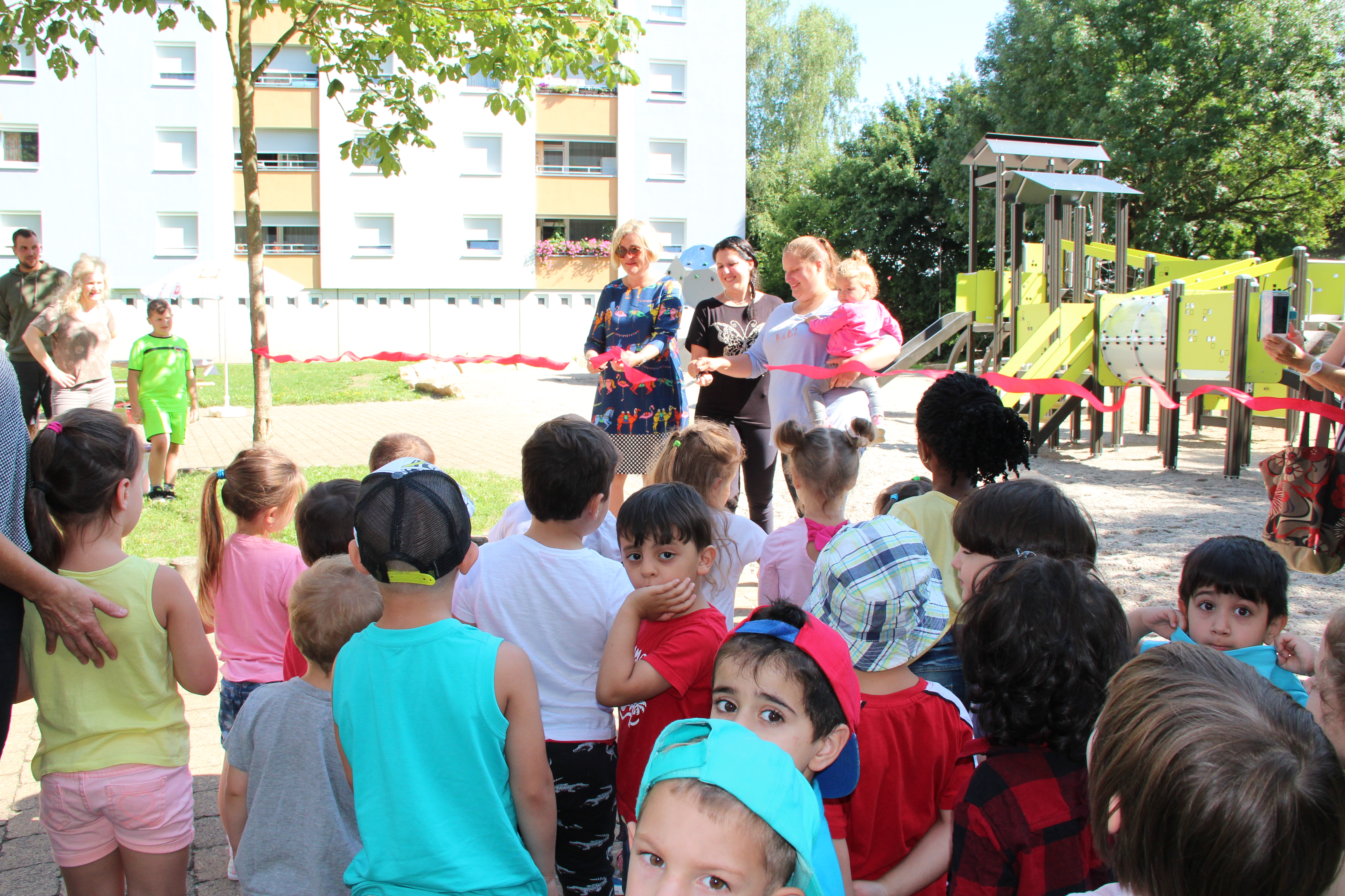 Pünktlich zum Beginn der Sommerferien war der Spielplatz dann auch fertig. Glücklich über die neue Ferienattraktion wurde dann auch sofort von der Caritas-Gemeinwesenarbeit Folsterhöhe ein „Dankeschön“-Termin vereinbart. So waren am 2. August zahlreiche Kinder auf dem Spielplatz, um nach einer musikalischen Darbietung und symbolischen Banddurchschneidung „ihren Spielplatz“ in Besitz zu nehmen. Gleichzeitig konnten noch drei Spielplatzpatinnen aus der Bewohnerschaft gewonnen werden, die zukünftig den Spielplatz im Auge behalten und melden, wenn etwas ein sollte.