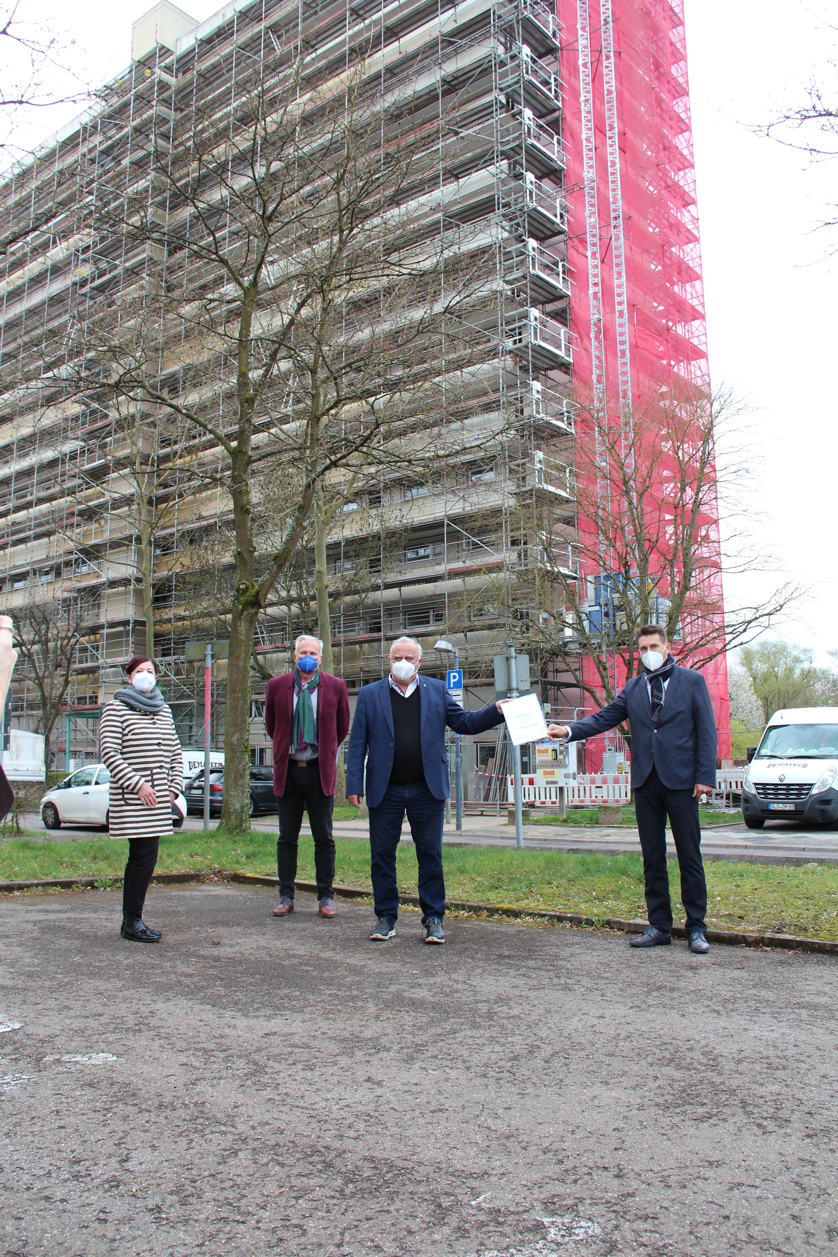 Bei der Übergabe war auch Oberbürgermeister Uwe Conradt anwesend. Als Vorsitzender des Aufsichtsrates der Siedlungsgesellschaft ist die Finanzierung einer derart großen Sanierung auch für ihn von großem Interesse. „Die Folsterhöhe ist ein beliebtes Wohngebiet, das durch die Investition weiter aufgewertet und noch attraktiver wird. Ich freue mich über die Maßnahme, durch die eine große Anzahl an bezahlbaren und zudem energetisch sanierte Wohnungen entstehen.“