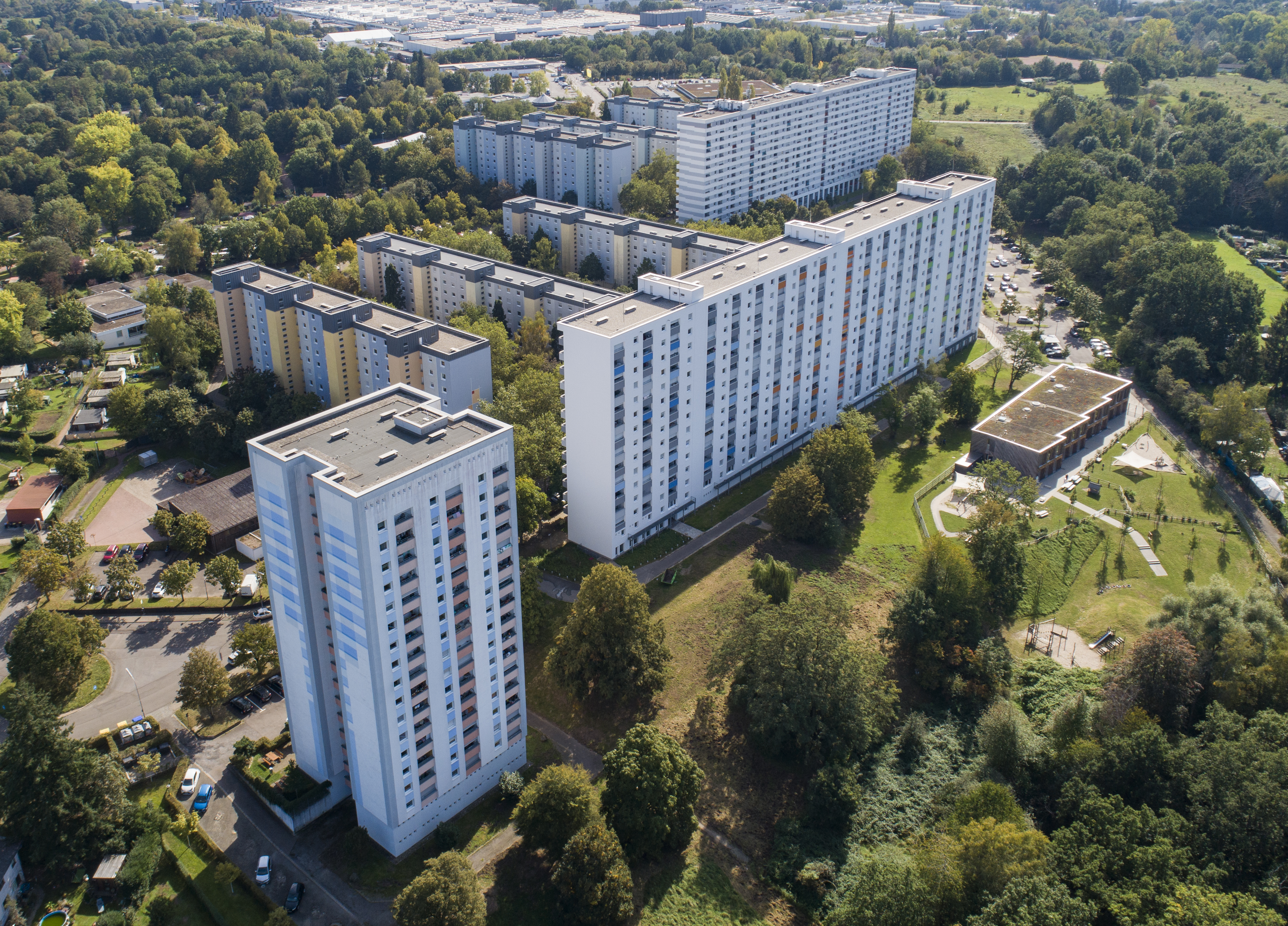 2001 begannen die Sanierungsmaßnahmen im Quartier: Der erste Wohnblock mit sechs Etagen wurde gedämmt und mit einer ansprechenden Putzfassade versehen, die Loggien wurden saniert und neue Fenster sowie Rolläden eingebaut.