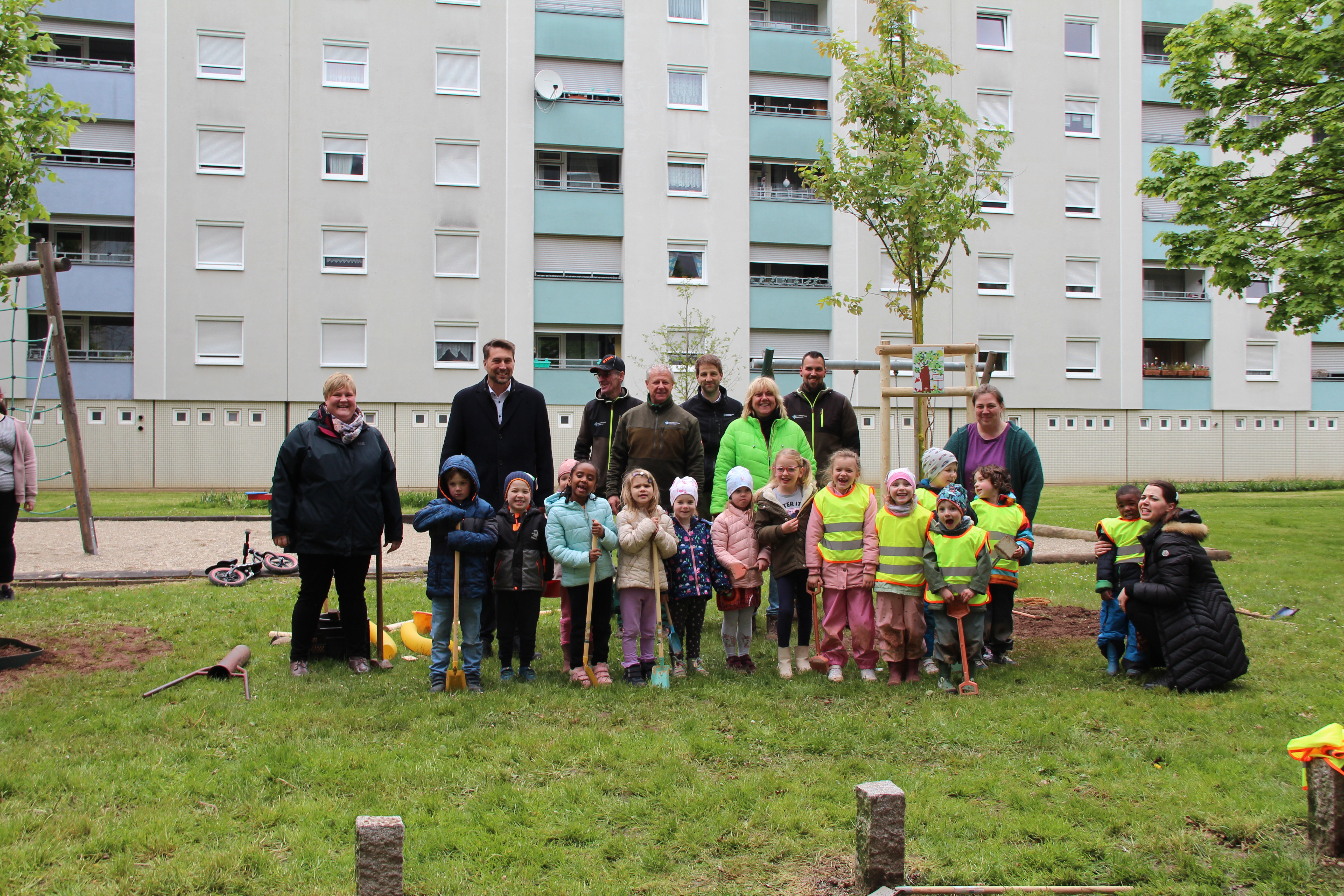 Hier schafft die Siedlungsgesellschaft als Vermieterin nun Abhilfe und pflanzt mit Kindern der beiden Kindertagesstätten Heilig Kreuz und Hirtenwies zwei hitzeresistente Bäume – eine Ulme und eine Zelkove. Jede Kindertagesstätte übernimmt eine Patenschaft und gestaltet jeweils ein individuelles Baumschild.